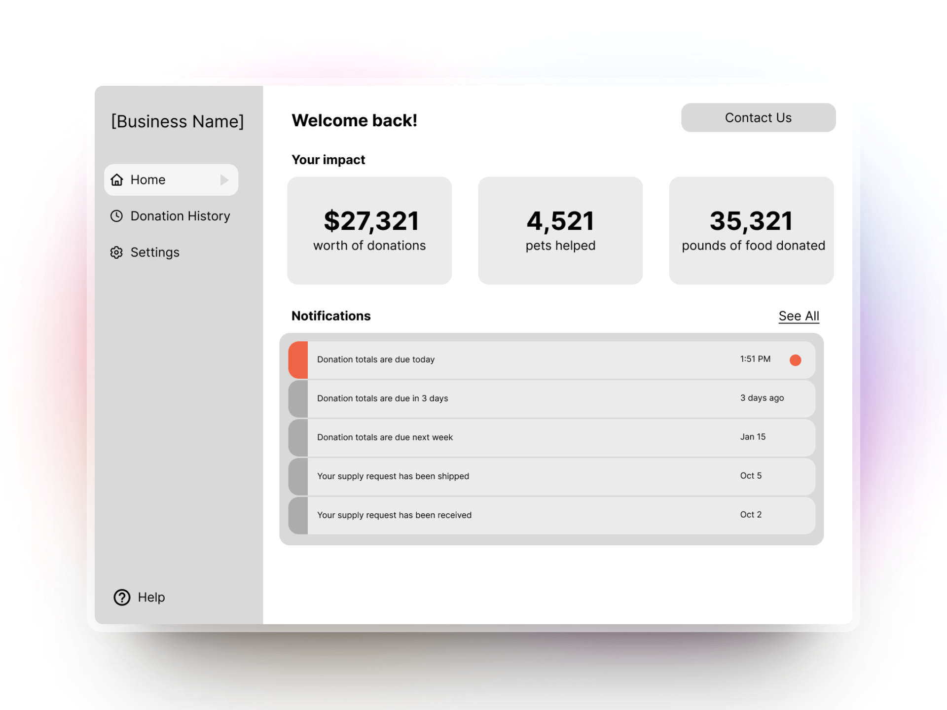- Their impact shows the dollar amount of their total donations, the total pounds they have donated, and the number of days since their last form submission; If businesses were able to see the impact of their donations, they would feel more inspired to keep donating. Seeing how many days it's been since their last submission ensures they know the timeline of when to submit again.