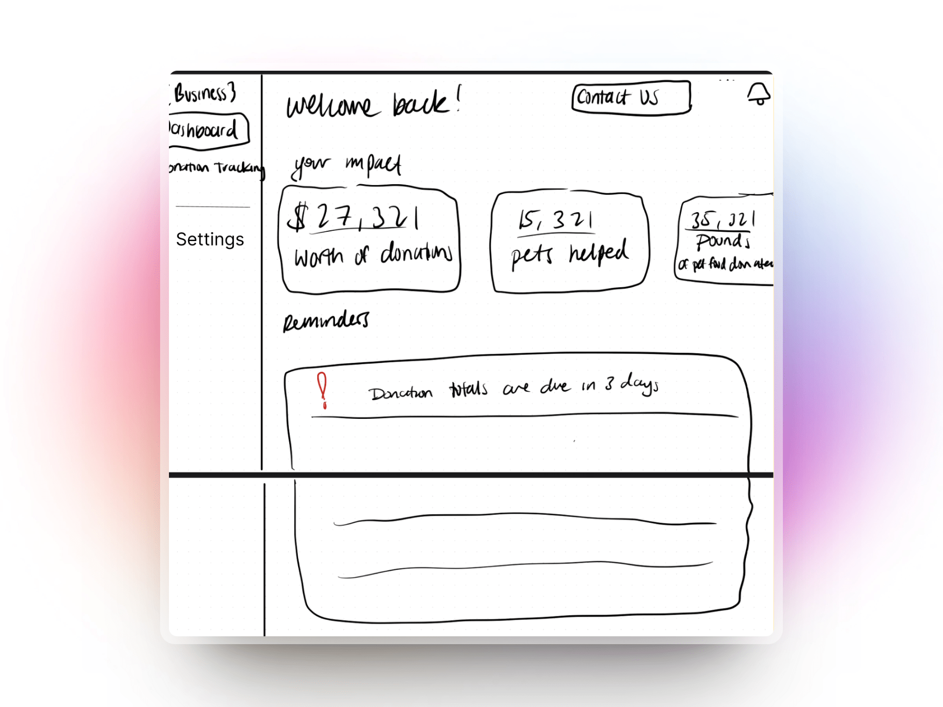 I created a user persona and user journey to better understand who would be using our website. This was especially helpful in brainstorming our website's functionality, as we laid out our user's pain points. I was able to identify possible opportunities to solve them, such as urgent notifications to help businesses remember to upload donation forms.